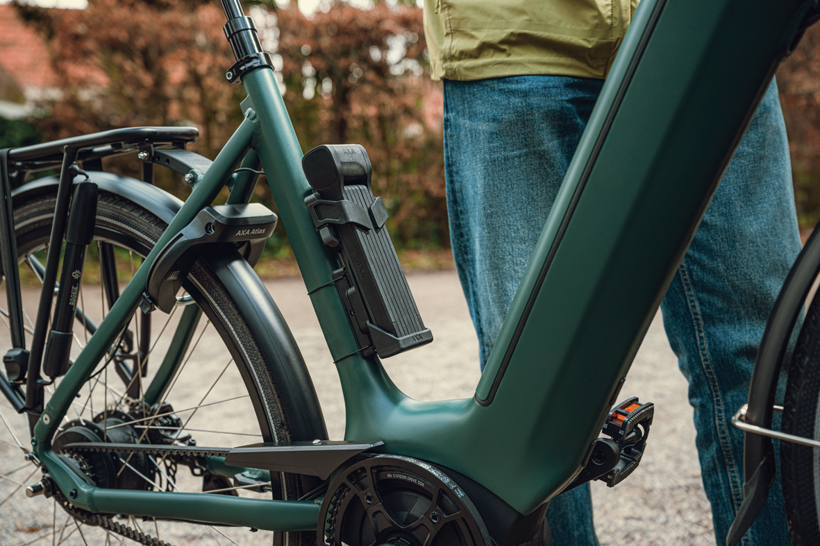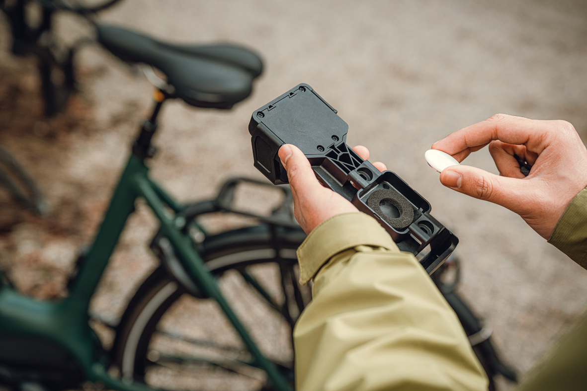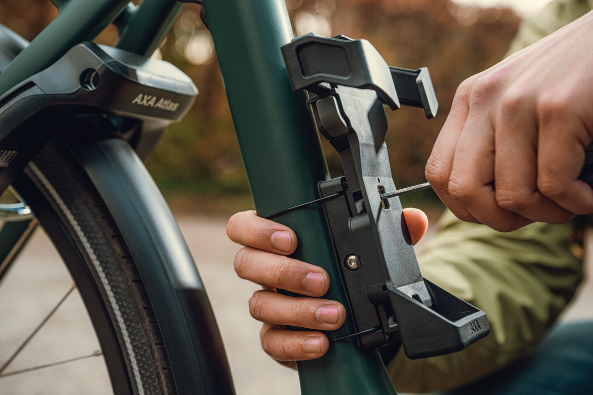 Die neue Halterung ermöglicht eine schnelle Montage und sicheren Transport. Hast du keine Montagepunkte an deinem Fahrrad, kannst du diese mit dem im Lieferumfang enthaltenen AXA Fix nachrüsten. Ein verstecktes Air‑Tag‑Fach in der Halterung macht das einfache Tracken des Rades möglich.