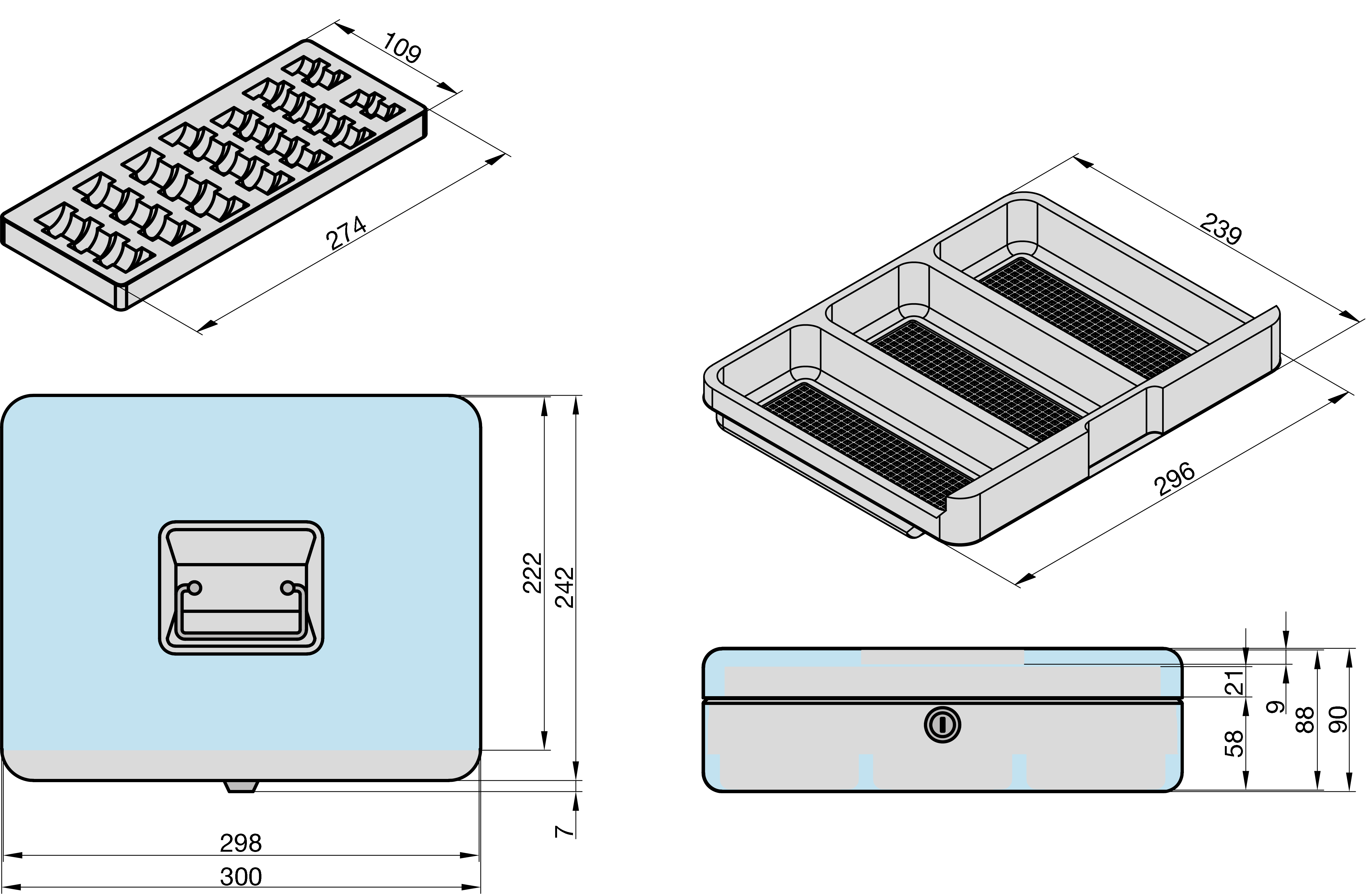 - Außenabmessung: Länge 300 mm, Breite 242 mm, Tiefe 90 mm