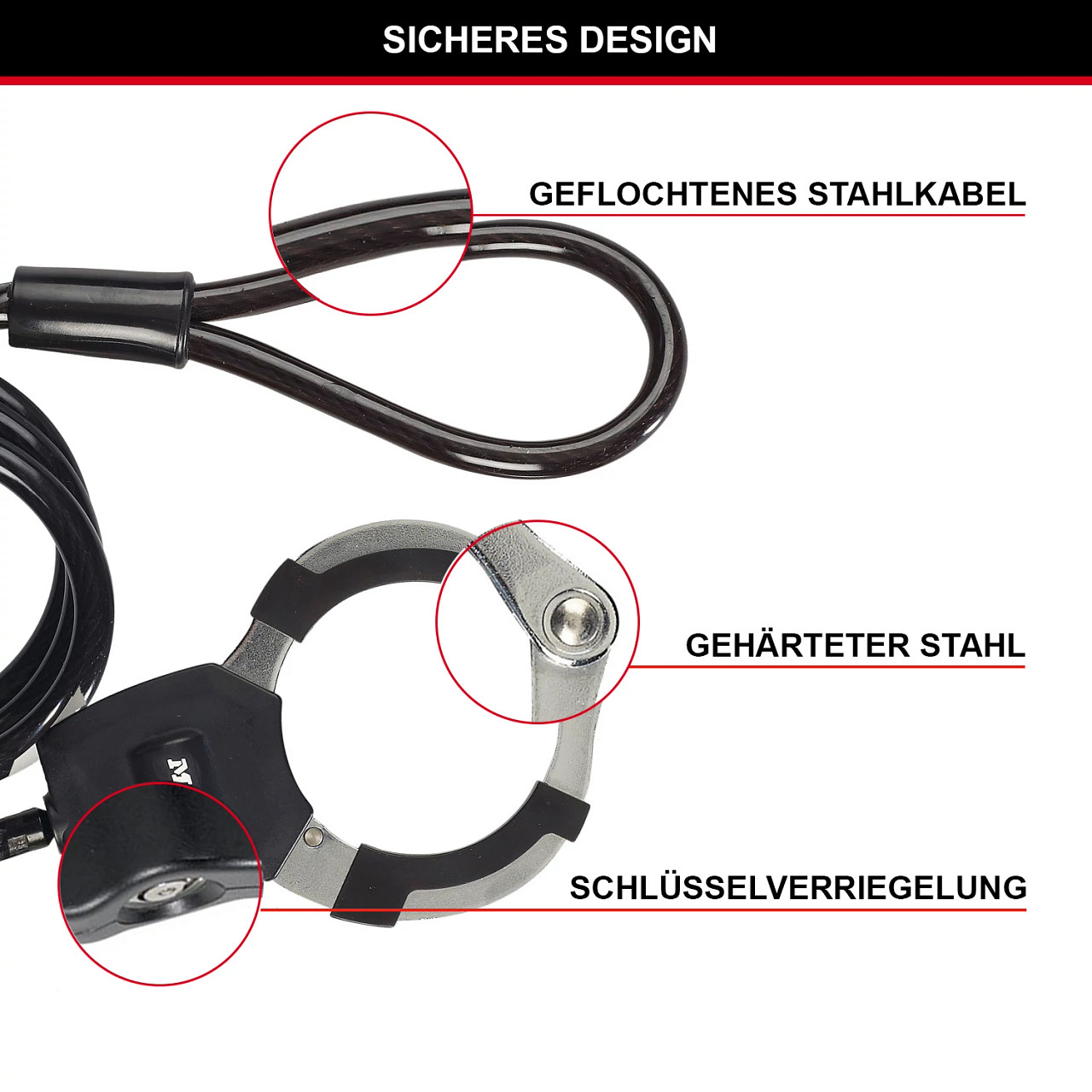 Das Schellenschloss 8275EURDPRO Street Cuff® von Master Lock ist 1 m lang und verfügt über ein besonders flexibles und massives Stahldrahtkabel mit einem Durchmesser von 8 mm. Die 1 m langen Schellen lassen sich bequem an Parkuhren, Zaunpfählen oder anderen Fahrrädern anschließen. Die Vinyl-Ummantelung schützt vor Kratzern. Der integrierte Verriegelungsmechanismus mit Stiftzuhaltung bietet einen besseren Schutz gegen Schlosspicking. So sichern Sie Fahrrad, Lastenrad, E-Scooter und vieles mehr. Die lebenslange limitierte Garantie gibt Ihnen die Sicherheit einer Marke, der Sie vertrauen können.